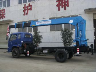 廂長4.7-4.9米,4102發(fā)動機,帶副變速,最大可選裝6.3噸吊機,該車配置的直臂式吊機,吊機布置位置為后置式,型號為TM-Z603,PYSQ141,TM-Z503、PYSQ112,質量為2720kg,2125kg,最大起升載荷為6000kg,5000kg,選裝新前圍飾件和保險杠及前部燈具,