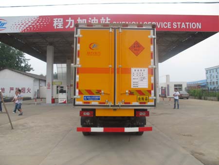 廂體頂部封閉,不可開啟。運(yùn)輸介質(zhì):黑火藥,壓縮黑火藥,電引爆雷管,爆破炸藥,點(diǎn)燃導(dǎo)火索,專用煙火制品。運(yùn)輸類項(xiàng)號(hào):1.1D,1.1D,1.1B,1.1D,1.4G,1.1G。側(cè)防護(hù)和后防護(hù)裝置材料材質(zhì)為Q235A碳鋼,側(cè)防護(hù)與箱體底部焊接連接,后防護(hù)裝置與車架采用車架連接,后防護(hù)截面尺寸(mm):100×50,離地高度為530mm。該車隨底盤選裝駕駛室,配裝限速裝置,最高時(shí)速80km/h。僅采用有前盤制動(dòng)器和安裝ABS的底盤。僅采用排氣管前置的底盤。僅采用子午線輪胎。安裝帶衛(wèi)星定位功能的行駛記錄儀。ISF3.8s4R154型號(hào)發(fā)動(dòng)機(jī)對(duì)應(yīng)油耗值為25.93,ISF3.8s4154型號(hào)發(fā)動(dòng)機(jī)對(duì)應(yīng)油耗值為26.75。ABS系統(tǒng)生產(chǎn)廠家/型號(hào):威伯科汽車控制系統(tǒng)(中國)有限公司/4460043200。