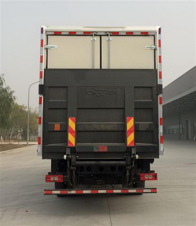 車廂頂部封閉,不可開啟.ABS型號(hào)44600XXXX0,廠家威伯科汽車控制系統(tǒng)(中國)有限公司,安裝具有衛(wèi)星定位功能的行駛記錄儀.選裝同等功率制冷機(jī)組,外觀形狀可不同.選裝雙側(cè)開門,側(cè)開門可取消,選裝液壓尾板,選裝導(dǎo)流罩.側(cè)防護(hù)的連接方式是與貨箱橫梁螺栓連接,側(cè)防護(hù)材料為冷板B-2.0;后防護(hù)連接方式是與車架縱梁螺栓連接,后下部防護(hù)裝置材料為異型管20-D.后部防護(hù)裝置截面尺寸100mm×50mm,后防護(hù)離地高545mm. |