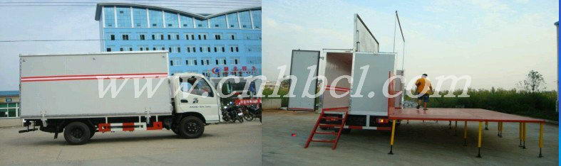 可選裝導(dǎo)流罩,隨底盤選裝新造型的前圍下面罩.廂體右側(cè)板有兩種結(jié)構(gòu):一種為右側(cè)板分為上下兩部分,上部分連同頂板向上開(kāi)啟形成舞臺(tái)頂棚,右側(cè)板下部分向外翻平形成舞臺(tái)平面。另一種為可選裝舞臺(tái)廂體右側(cè)板為整體式結(jié)構(gòu),右側(cè)板連同頂板向上開(kāi)啟形成舞臺(tái)頂棚,右側(cè)內(nèi)板向外翻平形成舞臺(tái)平面。因舞臺(tái)廂體結(jié)構(gòu)以及高度選擇不同,使整備質(zhì)量在3%以內(nèi)誤差,可忽略不計(jì). |
