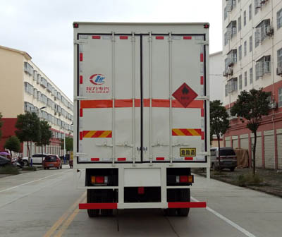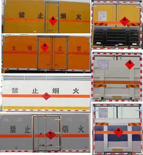 該車適用于運(yùn)輸危險(xiǎn)品。廂體頂部封閉, 不可開啟。該車主要用于運(yùn)輸獨(dú)立容器包裝的易燃?xì)怏w:液化石油氣, 原油氣, 壓縮天然氣, 乙炔, 甲烷, 乙烷, 丙烷, 丁烷, 丙烯, 丁烯, 二甲醚, 硫化氫, 打火機(jī)或打火機(jī)加油器(裝有易燃?xì)怏w), 壓縮氫, 類項(xiàng)號:2.1; 運(yùn)輸具有獨(dú)立容器包裝的非易燃無毒氣體:液化氣體(非易燃, 充有氮, 二氧化碳或空氣), 壓縮氧(氮, 空氣, 氦, 氬, 氖), 二氧化碳, 類項(xiàng)號2.2; 運(yùn)輸具有獨(dú)立容器(瓶)包裝的易燃?xì)怏w:壓縮煤氣, 液氯, 類項(xiàng)號:2.3。防護(hù)材料:Q235A碳鋼, 連接方式:左右側(cè)面及后下部防護(hù)均采用焊接連接, 后部防護(hù)斷面尺寸(mm):120×50, 后部防護(hù)離地高度(mm):530。僅采用底盤子午線輪胎和帶ABS的底盤, 該車前輪安裝盤式制動(dòng)器, 前置排氣管, 裝配限速裝置, 限速80km/h。安裝帶有衛(wèi)星定位功能的行駛記錄儀。ABS型號/生產(chǎn)廠家:ABS-E 4S/4M/威伯科汽車控制系統(tǒng)有限公司。油耗對應(yīng)關(guān)系(L/100km):37(YC6J220-50), 37(YC6JA220-50)。隨底盤選裝駕駛室, 選裝側(cè)門型式及位置, 選裝后部液壓尾板; 廂體顏色可變化, 文字噴涂位置可變化。后部液壓尾板收起狀態(tài)長度是250mm。