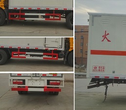 該車適用于運(yùn)輸危險(xiǎn)品。選裝右側(cè)箱體不開門, 車廂頂部不可開啟。選裝不開側(cè)門時(shí)對(duì)應(yīng)的寬度為2400mm。選裝側(cè)門型式及位置, 廂體顏色可變化, 文字噴涂位置可變化。安裝限速裝置, 限速80km/h。安全裝置為導(dǎo)靜電帶, 用于防止靜電。該車安裝帶有衛(wèi)星定位功能的行駛記錄儀, 僅采用前盤制動(dòng)器和安裝ABS的底盤, 排氣管前置, 僅采用子午線輪胎。該車主要用于運(yùn)輸具有獨(dú)立容器(瓶)包裝的氨溶液(氨水), 甲醛溶液, 除銹磷化液(除銹磷化處理劑), 電池, 電池液, 木餾油, 類項(xiàng)號(hào):8。側(cè)防護(hù)和后防護(hù)裝置材料材質(zhì)為Q235A碳鋼, 側(cè)防護(hù)與箱體底部焊接連接, 后防護(hù)裝置與車架采用焊接連接。后防護(hù)截面尺寸(mm):100×50, 離地高度為510mm。僅采用發(fā)動(dòng)機(jī)CY4SK251對(duì)應(yīng)的油耗值為:23.6。ABS系統(tǒng)生產(chǎn)廠家及型號(hào) :襄陽(yáng)東風(fēng)隆誠(chéng)機(jī)械有限責(zé)任公司, ABS/ASR-24V-4S/4M。