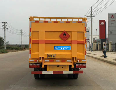 該車適用于運輸危險品, 主要用于運輸具有獨立容器(瓶)包裝的液化石油氣, 丁烷, 乙炔, 乙烷, 丙烷, 丁烯, 打火機或打火機加油器, 二氧化碳, 壓縮氧(氮, 空氣, 氦, 氬, 氖); 壓縮煤氣, 類項號:2.1, 2.2。該車運輸?shù)慕橘|(zhì)為2.1項易燃氣體時, 車輛采用”易燃氣體”標識牌, 運輸?shù)慕橘|(zhì)為2.2項非易燃無毒氣體時, 車輛采用”不燃氣體”標識牌。選裝后部液壓尾板, 箱欄板內(nèi)長(mm):3800, 貨欄顏色可變化, 文字噴涂位置可變化。后部液壓尾板收起狀態(tài)長度是250mm。 采用發(fā)動機型號CY4BK551, YC4FA115-50, D28D11-5DA, 對應(yīng)油耗值分別為油耗 (L/100km):12.4, 12.6, 12.6。防護材料:Q235A碳鋼, 連接方式:左右側(cè)面及后下部防護均采用焊接連接, 后部防護斷面尺寸(mm):100×50, 后部防護離地高度(mm):350, 該車安裝帶有衛(wèi)星定位功能的行駛記錄儀, 僅采用前盤制動器和安裝ABS以及前置消聲器的底盤, 采用子午線輪胎, 安裝限速裝置, 限速80km/h, 專用裝置為固定用卡槽。車輛前輪距僅采用1503mm。ABS廠家及型號:襄陽東風隆誠機械有限責任公司/ABS/ASR-24V-4S/4M。