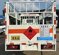 該車(chē)適用于運(yùn)輸危險(xiǎn)品,主要用于運(yùn)輸具有獨(dú)立容器(瓶)包裝的液化石油氣,丁烷,乙炔,乙烷,丙烷,丁烯,打火機(jī)或打火機(jī)加油器,二氧化碳,壓縮氧(氮,空氣,氦,氬,氖),類(lèi)項(xiàng)號(hào):2.1,2.2。該車(chē)運(yùn)輸?shù)慕橘|(zhì)為2.1項(xiàng)易燃?xì)怏w時(shí),車(chē)輛采用”易燃?xì)怏w”標(biāo)識(shí)牌,運(yùn)輸?shù)慕橘|(zhì)為2.2項(xiàng)非易燃無(wú)毒氣體時(shí),車(chē)輛采用”不燃?xì)怏w”標(biāo)識(shí)牌。貨欄顏色可變化,文字噴涂位置可變化,選裝無(wú)柵欄。僅選用發(fā)動(dòng)機(jī)D19TCIE10的油耗值為8.2L/100km.整車(chē)長(zhǎng)/軸距/后懸對(duì)應(yīng)關(guān)系為(mm):5360/2800/1480,5360/2650/1630,5200/2500/1620.側(cè)面以及后部為裙邊結(jié)構(gòu),與防護(hù)相干涉,可豁免;后部下沿離地高400mm,該車(chē)安裝帶有衛(wèi)星定位功能的行駛記錄儀,采用前盤(pán)制動(dòng)器和安裝ABS以及前置消聲器的底盤(pán),采用子午線輪胎,安裝限速裝置,限速80km/h。專(zhuān)用裝置為固定用卡槽。ABS系統(tǒng)控制器型號(hào)為APG3550500A6,ABS系統(tǒng)控制器生產(chǎn)企業(yè)為浙江亞太機(jī)電股份有限公司。