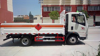 該車適用于運(yùn)輸危險(xiǎn)品, 主要用于運(yùn)輸具有獨(dú)立容器(瓶)包裝的液化石油氣, 丁烷, 乙炔, 乙烷, 丙烷, 丁烯, 打火機(jī)或打火機(jī)加油器, 二氧化碳, 壓縮氧(氮, 空氣, 氦, 氬, 氖), 類項(xiàng)號(hào):2.1, 2.2。該車運(yùn)輸?shù)慕橘|(zhì)為2.1項(xiàng)易燃?xì)怏w時(shí), 車輛采用”易燃?xì)怏w”標(biāo)識(shí)牌, 運(yùn)輸?shù)慕橘|(zhì)為2.2項(xiàng)非易燃無毒氣體時(shí), 車輛采用”不燃?xì)怏w”標(biāo)識(shí)牌。貨欄顏色可變化, 文字噴涂位置可變化, 選裝無柵欄。采用發(fā)動(dòng)機(jī)型號(hào)YN27CRE1, YN38CRE1, CY4BK151, JE493ZLQ5, D25TCIE1, D25TCIE3對(duì)應(yīng)油耗值分別為油耗 (L/100km):11.2, 11.6, 12.0, 11.4, 12.0, 12.0。整車長/軸距/后懸對(duì)應(yīng)關(guān)系為(mm):5995/3280/1555, 5995/3160/1675.防護(hù)材料:Q235A碳鋼, 連接方式:左右側(cè)面及后下部防護(hù)均采用焊接連接, 后部防護(hù)斷面尺寸(mm):100×50, 后部防護(hù)離地高度(mm):520, 該車安裝帶有衛(wèi)星定位功能的行駛記錄儀, 僅采用前盤制動(dòng)器和安裝ABS以及前置消聲器的底盤, 采用子午線輪胎, 安裝限速裝置, 限速79km/h, 專用裝置為固定用卡槽。ABS系統(tǒng)型號(hào)為XH-KQ4S4M-E01, 生產(chǎn)企業(yè)為廣州市西合汽車電子裝備有限公司。