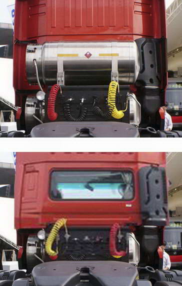 選裝平頂駕駛室,平頂駕駛室頂部導流罩為選裝件,高頂駕駛室頂部氣喇叭為選裝件;駕駛室后側(cè)擾流板和側(cè)裙板為選裝件,選裝前保險杠。選裝燃料罐體。發(fā)動機YC6MK375N-30、YC6M340N-30、EQRN350-30、EQRN380-30對應準拖掛車總質(zhì)量37185;發(fā)動機YC6M320N-30對應準拖掛車總質(zhì)量36385,配置變化引起的質(zhì)量參數(shù)變化在3%以內(nèi),可忽略不計。選裝前下視鏡安裝位置。 |