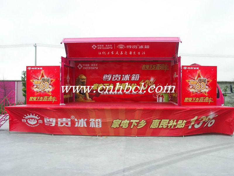 一、舞臺(tái)車基礎(chǔ)結(jié)構(gòu): 1) 舞臺(tái)車框架:方管鋼結(jié)構(gòu),便于牢固焊接。 2) 外部蒙板(兩側(cè)、前后):彩鋼板1.00MM,平整度高,利于張貼噴繪廣告。 3) 外部蒙板(頂板):彩鋼板 0.8MM。 4) 內(nèi)部蒙板:防腐PVC板3.0mm。 5) 頂部:2/3頂部作為頂升部分。 6) 舞臺(tái)地板(內(nèi)、外、延):防滑竹膠板10MM。 7) 舞臺(tái)頂部打開方式:氣壓系統(tǒng)打開,方便快捷。 8) 舞臺(tái)側(cè)邊打開方式:省力器機(jī)構(gòu)打開。 9) 側(cè)板圍邊:箱體兩側(cè)防護(hù)欄。 10) 舞臺(tái)支撐腿:1級(jí)調(diào)速,插孔同梯形螺紋相結(jié)合。 11) 舞臺(tái)稱重要求:滿足每平方米200kg負(fù)荷。 12) 舞臺(tái)步梯:1個(gè)步梯。 13) 舞臺(tái)面積:25平米。 14) 拼接板要求:堅(jiān)固鏈接,間隙小于5mm。 15) 基礎(chǔ)安全要求:所有高處收放動(dòng)作,具有二級(jí)保護(hù)措施。 16) 舞臺(tái)電路:廂體內(nèi)部布局安裝配電盤、、布局舞臺(tái)燈光線路、電源插座。 17) 配電系統(tǒng):外接插座采用安全防爆式、220V外接電源,電源線長50米,配卷線盤,安全保護(hù)開關(guān),滿足負(fù)荷10千瓦。