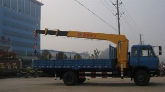 選裝隨車(chē)起重機(jī)型式為伸縮式,起重機(jī)型號(hào)、質(zhì)量和最大起升載荷分別為(Kg):QYS-8IIIA:4000,8000;QYS-6.3III:3500,6300。各尺寸參數(shù)與質(zhì)量參數(shù)對(duì)應(yīng)關(guān)系如下(外形長(zhǎng)度尺寸,大箱長(zhǎng)度尺寸,接近角/離去角,前懸/后懸,載質(zhì)量,整備質(zhì)量,吊機(jī)): 8500,5300,34/14,1250/2550,6605,9100,QYS-8IIIA;8500,5300,34/14,1250/2550,7105,8600,QYS-6.3III;9000,5800,34/18,1250/2650,6405,9300,QYS-8IIIA;9000,6100,34/18,1250/2650,6905,8800,QYS-6.3III。 |