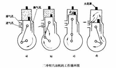 二沖程發(fā)動機(jī)工作循環(huán)也包括進(jìn)氣、壓縮、作功和排氣四個(gè)過程,但它是在活塞往復(fù)兩個(gè)行程內(nèi)完成的。
