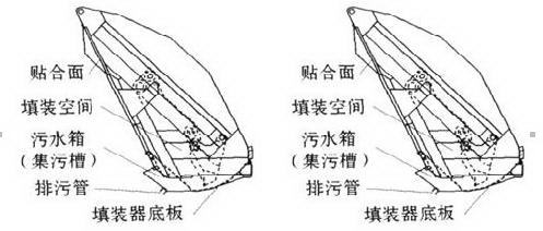 程力垃圾車在第二種方案中,壓縮式垃圾車污水箱擴容方法是將填裝器的部分空間用于集納污水。針對5t左右的車來講,以往的污水箱與填裝器的填裝空間相互獨立。如圖2,不考慮填裝空間的利用時,壓縮式垃圾車污水箱容積只有120L,無法充分滿足對污水的集污要求,但在填裝器底板最低處B點橫向開4~5個20mm左右的圓孔,連通兩個空間后,壓縮式垃圾車污水箱容積擴大一倍以上,集污能力大大增加。相比之下,第一種方案污水箱容積局限在60~80 L之間,常常是邊裝垃圾邊流污水。