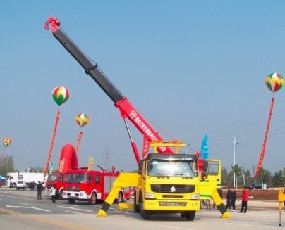 6、吊臂伸長(zhǎng)后可以從很高點(diǎn)提升重物,此時(shí)務(wù)必不要單邊負(fù)載太多而使得整車重心偏出安全范圍,特別應(yīng)注意的是在旋轉(zhuǎn)吊臂與清障車縱向中心線橫向成直角時(shí)的狀態(tài),極容易因負(fù)重力矩太大而使清障車傾覆。一般可對(duì)照吊臂起吊能力曲線圖來(lái)確定或判斷吊臂當(dāng)時(shí)的受力允許狀態(tài)。