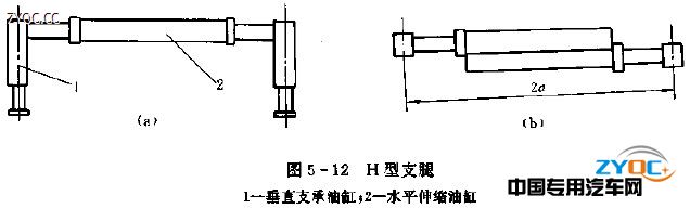 通常采用H型支腿,即左右各一個(gè)支承。每個(gè)支腿各有一個(gè)水平伸縮液壓缸,一個(gè)垂直支承液壓缸。起吊作業(yè)時(shí)支腿外伸呈H型,見圖5-12(a)所示,行駛時(shí)收回,為保證支腿收回時(shí)不超出車輛行駛時(shí)的寬度標(biāo)準(zhǔn),外伸時(shí)又有足夠的支承距離,可將左右支腿的水平液壓缸錯(cuò)開安放,如圖5-12(b)所示。