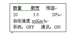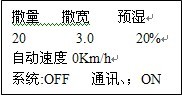 表示當(dāng)前給料量是每平方米20克,撒布寬度為3米,預(yù)濕變頻器轉(zhuǎn)速為撒量變頻器轉(zhuǎn)速的20%,車速為每小時(shí)0公里