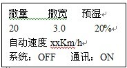 注意:撒布量、撒布寬度、車速三項(xiàng)參數(shù)在數(shù)據(jù)計(jì)算中是乘積關(guān)聯(lián)關(guān)系,如果其中一項(xiàng)或幾項(xiàng)過大會(huì)導(dǎo)致撒量電機(jī)的給料速度超過1600轉(zhuǎn)/分,在這種情況下,控制儀就會(huì)報(bào)警,并且撒量電機(jī)的給料速度固定為1600轉(zhuǎn)/分,此時(shí),因?qū)⑷隽恐祷蛉鰧捴禍p小,或者使車速減小,達(dá)到撒量電機(jī)的轉(zhuǎn)速小于1600轉(zhuǎn)/分。