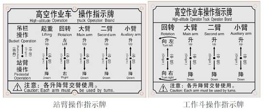 ②二臂升降:先扳動調速操縱桿,再將轉臺標牌上的上臂按鈕按下相應位置不放(升或降),上臂即可升或降。