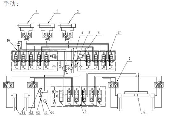 當下部工作時,扳動支腿操縱閥中相應操作桿,壓力油經(jīng)各管道和雙向液壓鎖使相應的支腿動作。