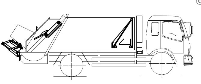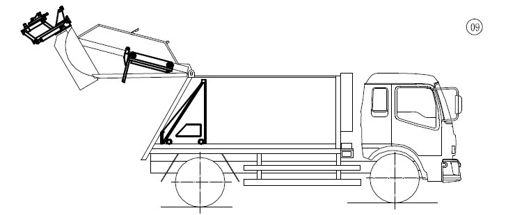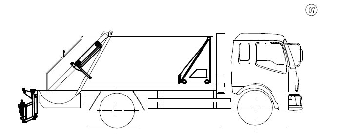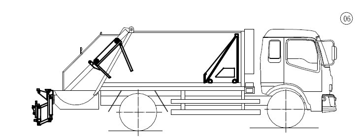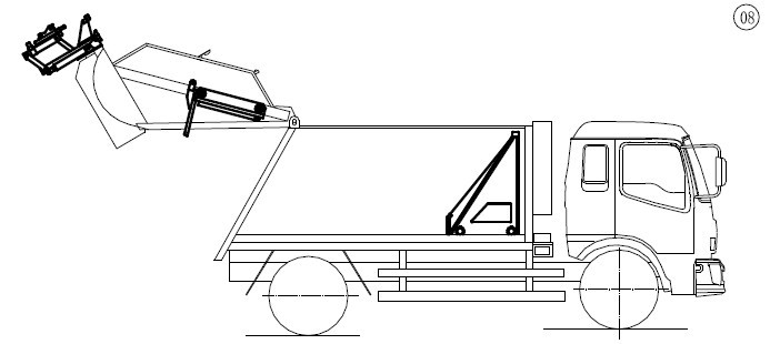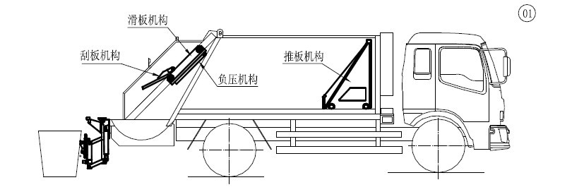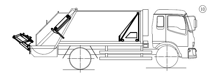 步驟10.旋轉(zhuǎn)推板操作旋鈕至左收回位置,推板被收回,松開旋鈕;再旋轉(zhuǎn)舉斗操作旋鈕至左下落位置,斗體放下并與車箱鎖緊,松開旋鈕,同時松開取力器(若翻桶機構(gòu)為放下位置,請將其翻上),此時整車可移動。整車移動時各機構(gòu)位置如圖所示: