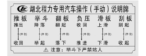 在裝載垃圾前,空載運轉(zhuǎn)達到6個標準時,掛上取力器(駕駛室內(nèi)方向盤左下方),檢查各部件有無泄漏或異常后,再按照操作旋鈕牌指示位置進行操作;