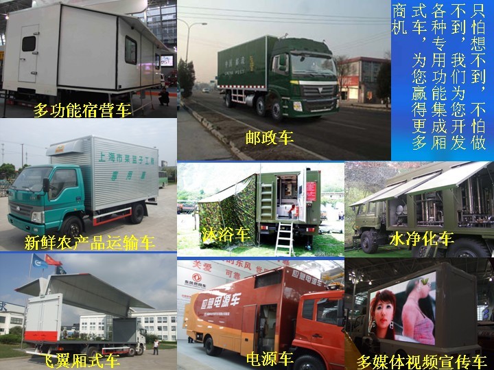 舞臺(tái)車 多功能宿營車 郵政車 新鮮農(nóng)產(chǎn)品運(yùn)輸車 沐浴車 水凈化車 飛翼廂式車 電源車 多媒體視頻宣傳車展示