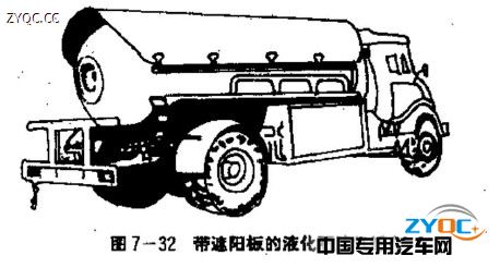 對于裝運低溫物質(zhì)或有特殊要求的液化氣罐,還必須采取隔熱保溫措施,防止因超溫、超壓而發(fā)生事故。常采用以下三種措施:一是隔熱層,在罐體表層敷設(shè)隔熱保溫材料(如泡沫塑料、玻璃棉、巖棉、聚氨酯等),在其外殼上又包有蒙皮。這種隔熱保溫方式用途廣泛,價格較低,質(zhì)量也較輕,常用于裝運液化乙烯、液化二氧化碳罐車等;二是真空夾套,如圖7-31b所示,在液化氣罐的外面再加一層罐體,兩層罐體之間填充干燥劑和保溫材料,并抽成真空。它具有良好的隔熱效果,是裝運液氧、液氬等低溫介質(zhì)的理想罐體;三是遮陽板,如圖7-32所示。它是在罐體的頂部裝設(shè)防止陽光暴曬的遮陽板,遮陽板與罐體相隔一定距離,形成前后相同的夾層。罐車行駛時,利用流動氣流散熱。遮陽板采用反光較強(qiáng)的白色,以降低吸熱量。這種結(jié)構(gòu)多用于液化石油氣罐車。