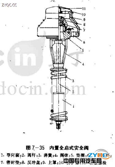 液化石油氣罐車采用內(nèi)置全啟式安全閥,如圖7-35所示。該閥屬于單反沖盤結(jié)構(gòu),彈簧3部分裝在罐體內(nèi),降低了安全閥外漏部分的高度,對降低車輛高度和安全閥自身安全是有利的。反沖盤8裝在閥桿2的頂端,彈簧3裝在閥體4的下方,閥桿下端與彈簧之間裝有導(dǎo)向套1.它對彈簧起導(dǎo)向定位作用,彈簧下端通過彈簧座由螺母鎖緊在閥桿2上,通過調(diào)整該螺母來調(diào)整彈簧3的預(yù)緊力,以調(diào)整安全閥的開啟壓力。彈簧3表面進(jìn)行鍍鉻防腐處理,以延長其使用壽命。