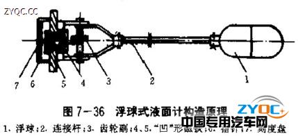 液化石油氣罐車上使用的浮球式液面計,如圖7-36所示。其工作原理是:浮球1隨罐體內(nèi)液面的高度而升降,帶動聯(lián)接桿2,齒輪副3及“凹”形磁鐵4轉(zhuǎn)動,由于磁場力的作用,使液面計隔板外側(cè)的“凹”形磁鐵5也隨著“凹”形磁鐵4的轉(zhuǎn)動而轉(zhuǎn)動,從面就把罐體內(nèi)的液面高度間接地反映到液面計的刻度盤7上。在液面計刻度盤的涂色色帶上涂有4中不同顏色,以表示4中不同的充裝容積區(qū)段。黑色為零位區(qū)、綠色為正常充裝區(qū),黃色為充裝注意區(qū)(即充裝容積為總?cè)莘e的80%~85%),紅色為危險區(qū)(即充裝容積已超過總?cè)莘e的85%)。為了防止因浮球式液面計失效而無法確認(rèn)罐內(nèi)的液面高度,有些罐車在其總?cè)莘e的85%、80%、40%三處分別設(shè)有指示閥,以確認(rèn)罐內(nèi)的液面高度,避免超載。