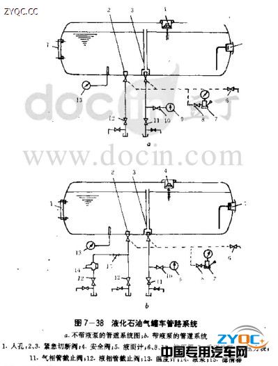 圖7-38為常用的液化石油氣罐車的管路系統(tǒng),有的還設(shè)有液化石油氣計量系統(tǒng),以達(dá)到準(zhǔn)確裝卸的目的。