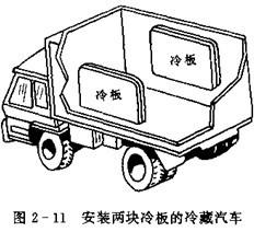 冷板的數(shù)量和布置主要取決于車廂容積的大小,微型冷藏汽車一般僅在廂內(nèi)前壁安裝一塊冷板,輕型冷藏汽車需裝2-3塊,中型冷藏汽車需裝3-5塊,重型冷藏汽車則不少于6塊。當廂內(nèi)采用2塊以上冷板時,廂內(nèi)兩側(cè)壁安裝的冷板應(yīng)該對稱布置。圖2-11為采用兩塊冷板的冷藏汽車廂內(nèi)布置。