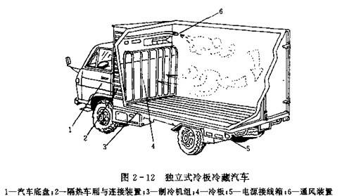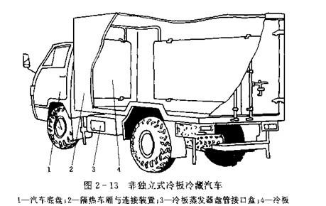 (1)獨立式冷板冷藏汽車(圖2-12),獨立式冷板冷藏汽車在車廂內(nèi)除裝有冷板外,還裝有對冷板進行“充冷”的制冷機組。需要時,僅需接通地面上的電源,即可自行對冷板進行充冷。圖2-12所示制冷機組3布置在車架縱梁左外側(cè),若此處不便布置,亦可將制冷機組布置在車廂膠壁上方。