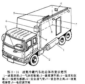 圖2-16為液氮冷藏汽車的總體布置示意圖。圖中,液氮容器1臥裝在底盤左側(cè)。氣體控制箱2安裝在液氮容器正前方。溫度控制箱4裝于車廂前壁的左上側(cè),溫度調(diào)節(jié)器3裝在駕駛室內(nèi),因此,操作者可在駕駛室內(nèi)直接控制液氮系統(tǒng)的工作,溫度傳感器5裝于廂內(nèi)頂部。液氮噴淋部件由噴淋管8、電控調(diào)節(jié)閥9與緊急停止開關(guān)7組成。緊急停止開關(guān)裝于廂門側(cè)旁,與廂門聯(lián)動。當廂門打開時,通過緊急停止開關(guān)使電控調(diào)節(jié)閥9關(guān)閉,整個系統(tǒng)的制冷暫時停止。安全通氣窗6裝于車廂后門,以保證廂內(nèi)氣壓不超過規(guī)定值。