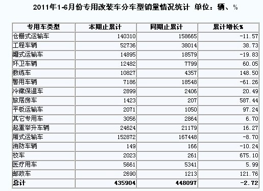 2011年上半年專用車?yán)塾?jì)銷量為43.6萬(wàn)輛,同比累計(jì)下降2.72%。