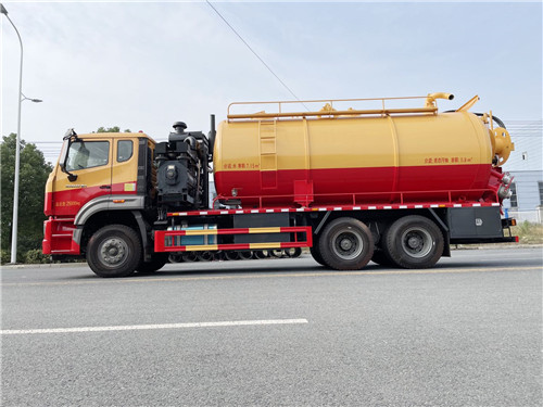 罐體總?cè)莘e22立方,罐體材質(zhì)筒體8mm,前封頭6mm,水污間內(nèi)封頭及后封頭均為8mm厚武鋼產(chǎn)優(yōu)質(zhì)碳鋼板材制作,清水倉為6-8立方,余下留作污罐使用,污罐底部鋪焊1.2米寬不銹鋼底板,頂部兩側(cè)做有碳鋼防滑平臺護欄,污罐頂部裝有水泥罐口,清水罐頂部為水車罐口,水污互通,清水灌左右各裝洗手龍頭一個,清水罐、污罐各做不銹鋼爬梯一個,中置頂(帶液壓鎖緊裝置),清洗部分采用品孚330流量高壓泵,后封頭帶有可旋轉(zhuǎn)齒輪自動液壓絞盤,后封頭下部開700mm液壓排污口1個,后封頭左下為DN150排污閥1個,DN100排污閥一個,后封頭右下為DN100排污閥1個,右上為DN100吸污閥1個帶內(nèi)抽管,后尾側(cè)為DN100吸污閥,右后輪與工具箱間為DN150偷排口,1個工具箱,操作箱隔成上下兩層,加大加高防溢閥,后尾部裝雙箭頭燈,清水罐頂部裝排氣閥1個,清水罐底部裝DN100排水閥1個,頂部65水污互通球閥。罐體兩側(cè)平臺用優(yōu)質(zhì)碳鋼材質(zhì),罐體可液壓舉升,后蓋不液壓開啟,吸污采用全新國三電噴430馬力副發(fā)動機配258水循環(huán)泵。