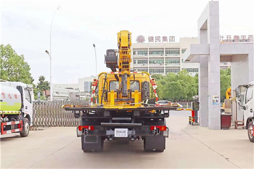 國六東風天錦黃牌清障車上裝配置;6mm厚花紋板,尾部帶翻轉,一拖二帶托臂,1個80KN液壓絞盤(帶25米鋼絲繩),8噸上裝,8噸3節(jié)式后托臂,上裝8噸四節(jié)臂吊機,上位操作,最大半徑11米舉升高度13米,全液壓全回轉,360度旋轉,固定液壓后支腿,板長6.5米。