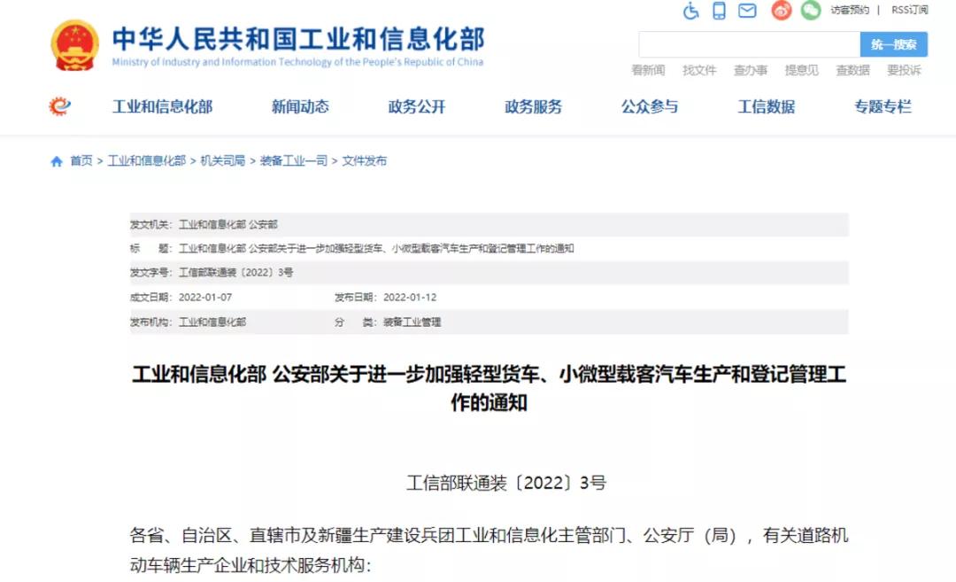 藍(lán)牌新政終于定了!1月12日,工業(yè)和信息化部、公安部關(guān)于進(jìn)一步加強(qiáng)輕型貨車、小微型載客汽車生產(chǎn)和登記管理工作的通知,其中規(guī)定不符合新規(guī)的產(chǎn)品在2022年3月1日起禁止生產(chǎn)。